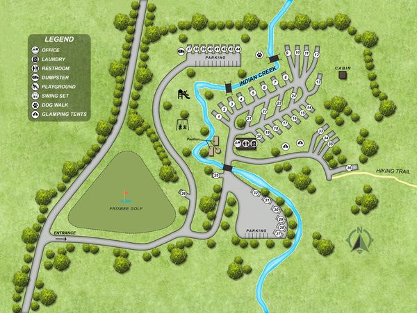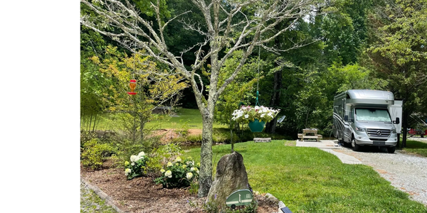 Blue Ridge Falls is surrounded by green trees, flowering plants and the winding Indian Creek.